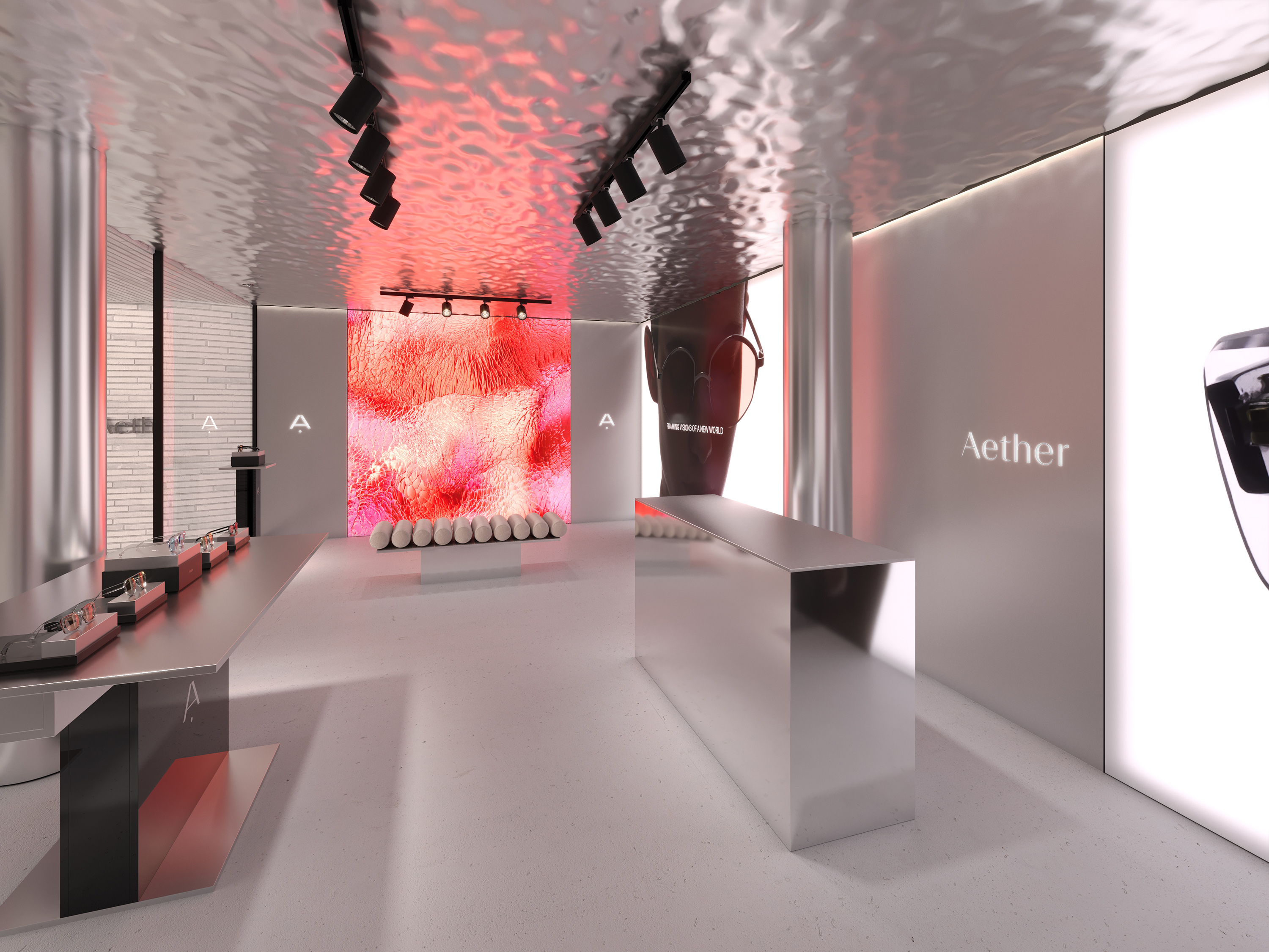 As a new brand fusing high-end style with cutting-edge audio technology, Aether faced the challenge of translating its DNA into retail spaces without losing its innovative edge. We needed to design pop-ups and in-store displays that conveyed the same sense of luxury and futurism as the products themselves.