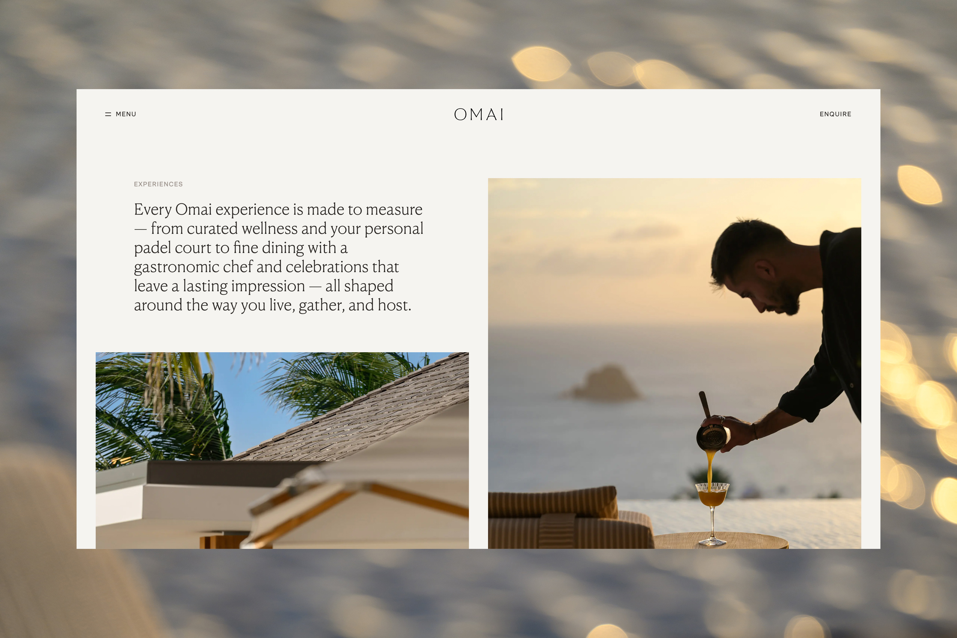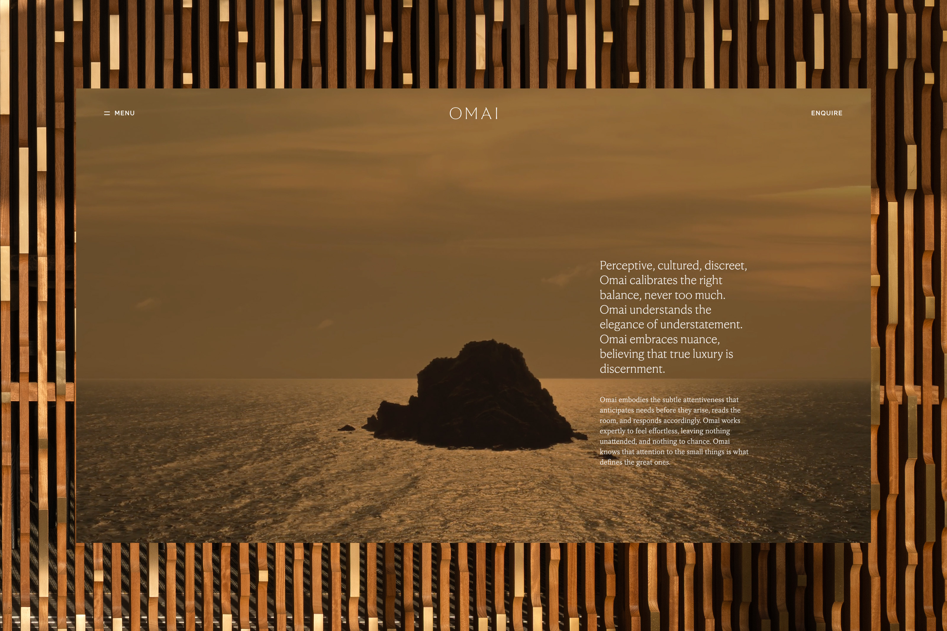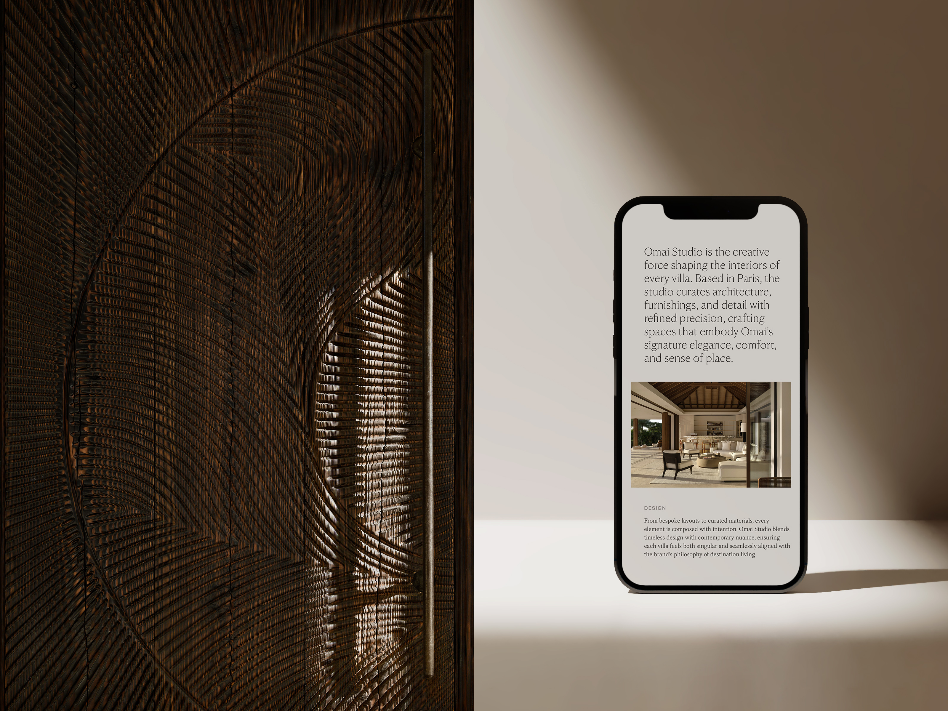 We began at the foundation, developing the brand strategy, narrative framework, and tone of voice that would give the Omai world its shape and direction. From there, we created the name Omai, designed a bespoke logotype and complete brand identity, and established the positioning language that ties the collection together. We then commissioned high-end photography to convey the true quality and atmosphere of the properties, and carried the identity through to a full website and printed materials. Our collaboration with Omai is ongoing, evolving alongside the collection as it grows.